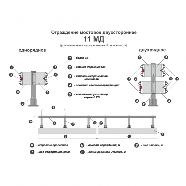 Мостовое ограждение 11МД – мостовое двустороннее барьерное ограждение, назначение которого предотвратить столкновение автотранспортных средств, движущихся во встречных потоках. Двусторонние мостовые ограждения устанавливаются на мостах, эстакадах и подобных конструкциях  с несколькими полосами движения. Способствует увличению уровня безопасности транспортных средств и пассажиров.