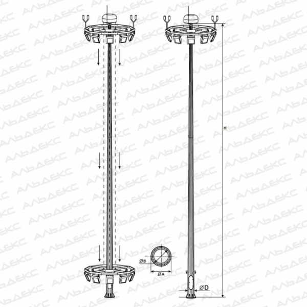 Высокомачтовые опоры освещения, предназначенные для монтажа большого количества светильников (до 12) на высоте, позволяющей увеличить их продуктивность и площадь охвата. Опоры ВМО-35-В исп. 6 заменяют собой сразу несколько стандартных опор освещения, что позволяет полностью окупить их увеличенную стоимость, связанную не только с большой металлоемкостью, но и со сложной организацией конструкций. При этом такие металлоконструкции отличаются оптимальным для своих габаритов весом, не создают излишней нагрузки на грунт, могут быть использованы для подземного подвода кабельной системы, что позволяет отказаться от протягивания дополнительных проводов. Системы используются на стадионах, на промышленных площадках и т.д. Их гармоничный дизайн и современное исполнение, а также возможность обслуживания без привлечения габаритной спецтехники, которой часто требуется специальный подъезд, позволяют использовать их при обустройстве жилых комплексов.
