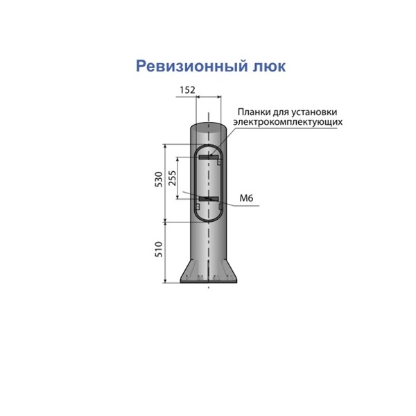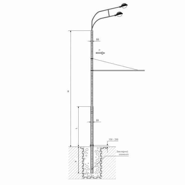 Опоры серии ТФ изготавливаются из высококачественного трубного проката по ГОСТ 10704-81 или ГОСТ 8732-78. У данных опор возможен как воздушный, так и подземный подвод кабеля. На опору стандартно устанавливаются кронштейны со светильниками. При подземном подводе питающих кабелей (через окна в закладном элементе) предусмотрены ревизионные лючки с планками установки комплектующих и точка заземления (болт М10). При воздушном подводе питания точка заземления выполняется на расстоянии 900...1000 мм ниже верхнего обреза опоры.